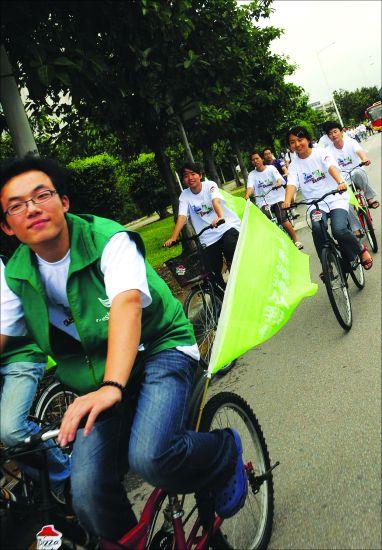 前天,100名大學(xué)生騎自行車?yán)@大學(xué)城宣傳環(huán)保。本報(bào)記者 馬強(qiáng) 攝