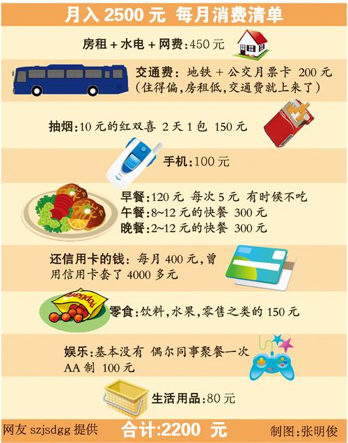 近日,一名剛剛踏入職場的年輕白領(lǐng)szjsdgg在大洋網(wǎng)上稱自己“月薪2500元在廣州的生活”:大學畢業(yè)1年半,工作1年多,現(xiàn)在在廣州拿著2500元左右的月薪,剛夠基本生活開銷,只剩下300元。