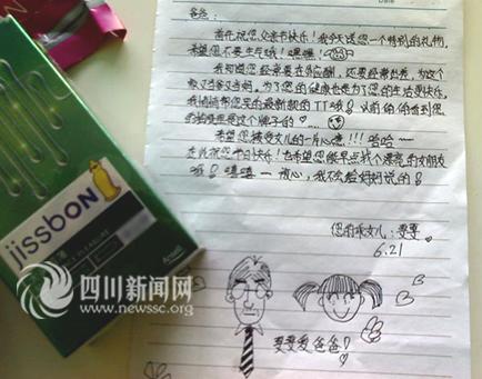 文中這樣寫道:“首先祝您父親節(jié)快樂,我今天送您一個(gè)特別的禮物,希望您不要生氣哦!知道您經(jīng)常在外應(yīng)酬,還要經(jīng)常出差,為這個(gè)家又當(dāng)?shù)之?dāng)媽。為了您的健康也是為了您的生活更快樂,我悄悄幫您買的最新款的TT哦!以前偷偷看到您的抽屜里是這個(gè)牌子的……”言語中,透露出女兒對父親的感激之情。最后,女兒還俏皮的說“希望您接受女兒的一片心意!。」诖俗D(jié)日快樂!也希望您能早點(diǎn)找個(gè)漂亮的女朋友哦,嘻嘻……放心,我不會給媽媽說的!”小女孩通篇用語樸實(shí)無華,天真無邪,讀來讓人感動(dòng)。