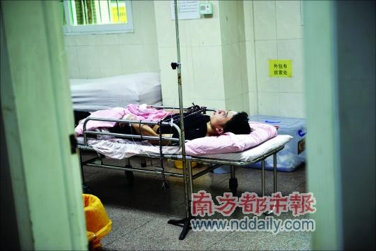 在番禺市橋醫(yī)院急診室內(nèi),撞車男子躺在病床上接受治療,為了保證安全,警察用繩索將其身體固定起來。男子情緒已趨于穩(wěn)定,只是因為之前的撞擊,頭部有明顯傷口。
