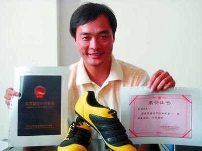 家住芙蓉區(qū)的周凱說,這雙球鞋的設計得追溯到幾年前!澳翘,我從電視轉播上看到貝克漢姆射出一個漂亮的弧線球,當時就被震驚了。從那以后,我就時常想,是不是我也能踢出一個這樣的弧線球!苯涍^20幾次修改圖紙,2005年,周凱向國家知識產權局提交了申請報告;2006年5月,產品獲得“實用新型專利證書”,產品名稱就叫:可加快足球旋轉的足球鞋。今年5月,周凱又憑此鞋獲得了“芙蓉青年創(chuàng)業(yè)大賽銀獎”。