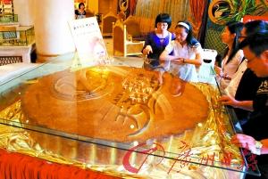 據介紹,月餅總重為380公斤,直徑160厘米,厚18厘米。為制作此餅,他們專門請了8個師傅做,僅制作成型就花了16個小時,然后又烘烤了4個小時才完成。僅極品蛋黃就用了30公斤,白蓮蓉用了180公斤,面粉用了150公斤。(記者王鵬、何波攝影報道)
