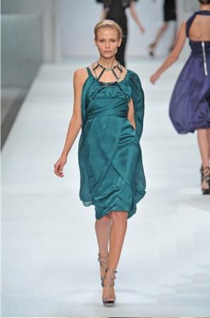 不對稱垂懸式肩袖,在身后形成飄逸的線條,前胸和腰間的圍裹設計,則是希臘風格常見的手法。