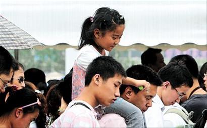 昨天,在園區(qū)內(nèi),騎在大人肩上的一名小女孩乖巧地為大人“扇風(fēng)”。