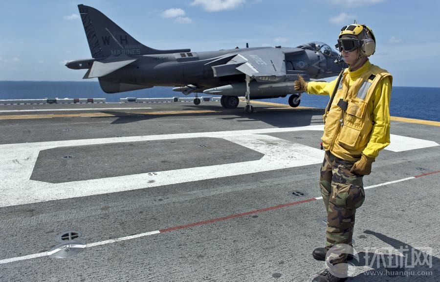在此次美菲聯合登陸演習中,一架AV-8B鷂式戰(zhàn)斗機從好人理查德號兩棲攻擊艦上起飛。