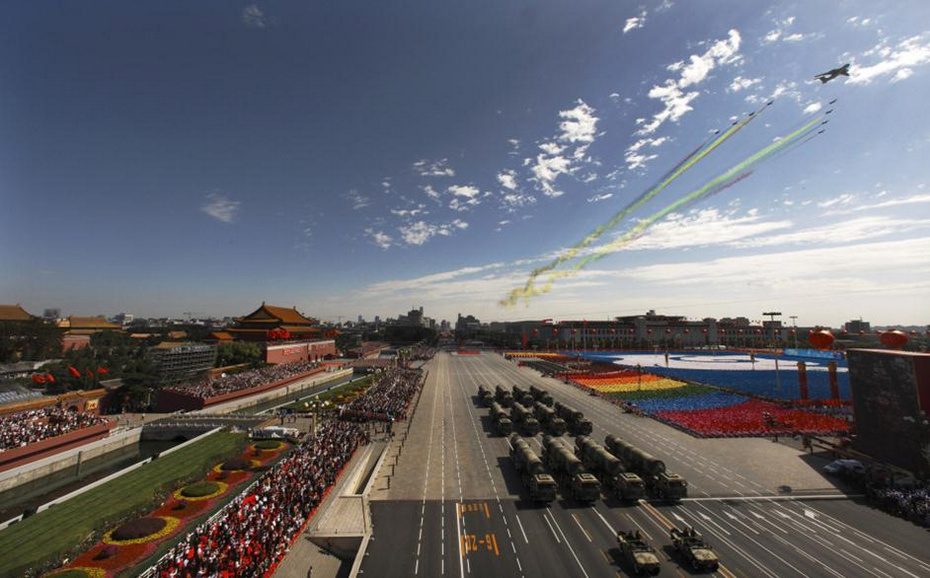 2009年10月1日,慶祝中華人民共和國(guó)成立60周年首都閱兵式上,多機(jī)編隊(duì)的領(lǐng)隊(duì)梯隊(duì)飛過(guò)天安門廣場(chǎng)。新華社記者 費(fèi)茂華 攝