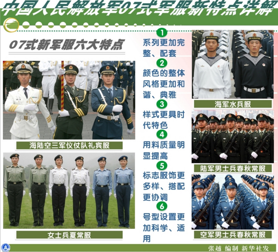 這是中國人民解放軍07式軍服新特點詳解的圖表。2007年7月起,全軍官兵陸續(xù)穿上07式軍服。這次我軍歷史上規(guī)模最大最系統(tǒng)的換裝,涉及禮服、常服、作訓服和標志服飾4個系列700多個品種。新華社發(fā)