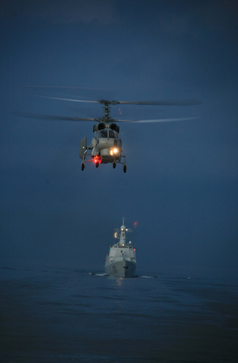 2008年12月28日夜,中國赴亞丁灣、索馬里海域護航編隊組織夜間直升機行進間著艦訓練。越來越多的中國軍人,正在以各種方式走出國門,走上國際舞臺。聯合國維和、國際人道主義救援、海外護航、中外軍隊聯演聯訓、軍事友好訪問,處處展現出和平之師的良好形象。2008年12月26日,中國海軍艦艇編隊首次遠赴亞丁灣、索馬里海域,為過往商船護航。截至2012年7月,先后有12批護航編隊參加護航任務,安全護送474批共4727艘中外船舶。新華社發(fā)