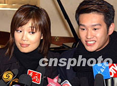 香港著名歌星容祖兒、2002年新秀冠軍吳浩康一月十日在香港為新歌《他都不愛(ài)我》拍攝MTV。圖為容祖兒、吳浩康接受記者采訪。錢興強(qiáng) 攝