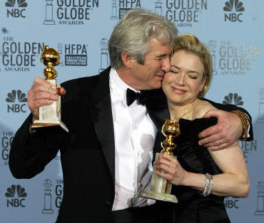 圖為李察·吉爾(左)和芮妮·齊維格(右)分別獲得音樂喜劇類電影最佳男、女主角獎(jiǎng)。