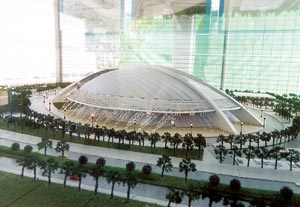 據(jù)了解,“澳門蛋”占地約4.5萬平方米、總建筑面積6.9萬多平方米!鞍拈T蛋”共分三區(qū):西北區(qū)為主場館、中區(qū)為副場館、南區(qū)為多功能館(會展中心),三場館均置于一個巨大穹頂之下,建筑高度為49米(穹頂標(biāo)高),屋頂樓面標(biāo)高為54米,縱向跨度為280米,橫向跨度為190米。“澳門蛋”為鋼筋混凝土框架結(jié)構(gòu),穹頂形屋面采用鋼架及復(fù)合陽光板材料,是一個半透明球體屋頂。