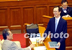 香港特區(qū)政府3月5日公布備受關(guān)注的香港2003至2004年度財(cái)政預(yù)算案,圖為財(cái)政司司長(zhǎng)梁錦松抵達(dá)立法會(huì)提交財(cái)政預(yù)算案時(shí)與議員交談甚歡。 洪少葵 攝
