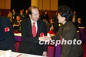 出席全國政協(xié)十屆一次會議的港澳委員七日在北京政協(xié)禮堂舉行聯(lián)組會,中共中央統(tǒng)戰(zhàn)部部長劉延?xùn)|向出席會議的何鴻燊表示問候。作者:毛建軍