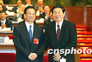 中新社北京三月十六日電本社記者張朔在人民大會堂現(xiàn)場報道:根據(jù)國家主席的提名,今天在這里舉行的十屆全國人大一次會議第六次會議決定,中共中央政治局常委溫家寶為中國新一屆國務(wù)院總理。