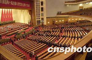 兩千九百多名全國人大代表出席閉幕會。新當選的全國人大常委會副委員長坐在主席臺前。中共中央政治局九常委全部出席會議。江澤民出席會議。剛剛卸下重任的李鵬、朱镕基、李瑞環(huán)、李嵐清出席會議。