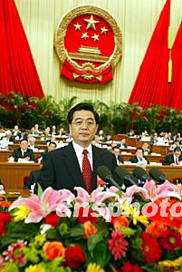 胡錦濤說,新一屆國家機構(gòu)工作人員是在國際形勢復(fù)雜多變、國內(nèi)建設(shè)任務(wù)艱巨繁重的新形勢下?lián)撝厝蔚,為了履行好人民賦予的神圣職責,我們一定努力做到: