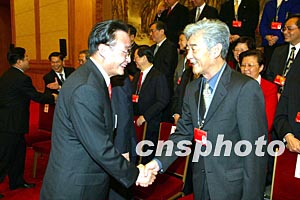 吳邦國委員長十八日下午在北京人民大會堂會見出席十屆人大一次會議的港澳代表。圖為吳邦國與香港代表吳康民握手。作者:毛建軍
