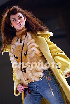 模特二十五日晚在北京舉行的中國國際時裝周上展示做工精美、設計獨特的2003香港新款皮草時裝。作者:毛建軍