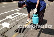 在香港“復活節(jié)”假期,全民總動員清潔香港預防病毒蔓延,21日衛(wèi)生部門派出人員消毒馬路污水渠道。洪少葵 攝
