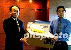 美國紐約哥倫比亞大學(xué)中國學(xué)生學(xué)者聯(lián)誼會(huì)購買了五千只世界衛(wèi)生組織推薦的N九五防護(hù)口罩,贈(zèng)送給戰(zhàn)斗在抗擊非典型肺炎第一線的中國醫(yī)務(wù)工作者。二十九日哥大學(xué)生代表將口罩樣品和捐贈(zèng)清單交給中國駐紐約總領(lǐng)事張宏喜(左)。作者:趙海燕
