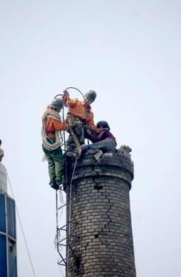 公安消防官兵開來云梯登高車后,空中的高壓線卻擋住了升起的云梯。由于光線昏暗,給搶救工作帶來困難。消防官兵將氣墊放在煙囪的四周,等待黎明的到來。
