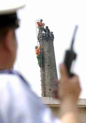 上午10時許,趁著瘋女子趴在煙囪上入睡,兩名消防隊員悄悄順煙囪上的攀登扶手爬上煙囪,用繩子套住瘋女的腳和腰部。
