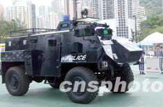 香港警務(wù)處2003年6月22日在香港維多利亞公園舉行的“同心攜手畫(huà)出彩虹”嘉年華活動(dòng)上,展示警用“Saxon撒臣裝匣運(yùn)兵車”。 中新社記者 錢(qián)興強(qiáng)