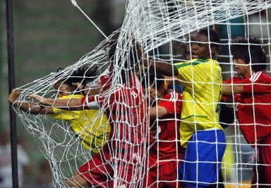 巴西隊開場后占據(jù)優(yōu)勢。第23分鐘,盧西奧長傳,阿德里亞諾突入禁區(qū),將球挑過魯斯圖的頭頂,巴西隊1比0領(lǐng)先。
