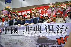 北京“雙解除”后,第一個(gè)境外旅游團(tuán)6月30日抵達(dá)北京。由60名韓國各界人士組成的旅游團(tuán)在北京機(jī)場向北京人民贈(zèng)送“祝賀中國戰(zhàn)勝非典”的橫幅。中新社記者 史利 攝
