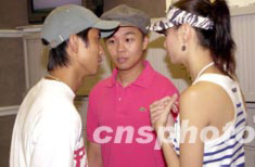 歌星黃伊汶、梁奕倫、范振鋒(右起)7月18日出席香港電臺節(jié)目《娛樂滿天星》訪問,三人同屬環(huán)球唱片公司,節(jié)目未開始時聚首交頭接耳了解事情最新動態(tài)。中新社記者:鄧慶樂