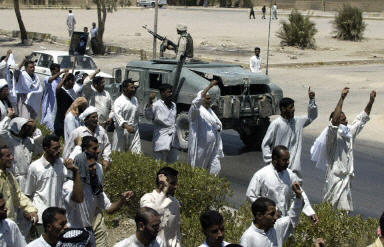 示威者在納杰夫市內(nèi)一主要清真寺門(mén)前集合,步行到由美國(guó)海軍陸戰(zhàn)隊(duì)把守的市政廳門(mén)前,并高呼“不要美國(guó)”等口號(hào)。有些憤怒的伊拉克人還向美國(guó)士兵投擲石塊,美軍沒(méi)有開(kāi)槍還擊。