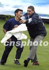 一名在昆明觀看西班牙皇家馬德里足球隊二十六日下午在的訓練的狂熱球迷跳入場中,口中呼喊著勞爾的名字,希望得到簽名,被及時趕來的工作人員阻止。中新社記者:毛建軍