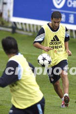 西班牙皇家馬德里足球隊二十六日下午在昆明冒雨訓練,圖為勞爾在對抗訓練中帶球過人。中新社記者:毛建軍