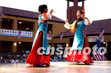 北加州華人運(yùn)動(dòng)會(huì)好時(shí)威之夜頒獎(jiǎng)晚會(huì)七月二十六日晚在美國(guó)圣荷西市舉行,生活在美西灣區(qū)的華裔演藝人士為頒獎(jiǎng)晚會(huì)獻(xiàn)上了精彩的演出。圖為中華演藝學(xué)院的學(xué)員表演蒙族舞《情思》。作者:陳鋼