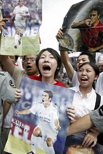 從八月一日凌晨開(kāi)始,眾多北京球迷聚集在皇家馬德里足球隊(duì)下榻的北京飯店門(mén)前,高聲呼喊戴維、勞爾等人的名字,渴望一睹巨星風(fēng)采。大批保安人員和警察在門(mén)口維持秩序。中新社記者:張煒 毛建軍