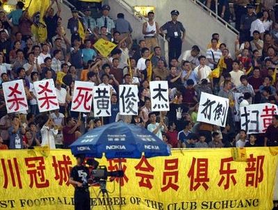 昨日京川之戰(zhàn)的上座率并不高,但球迷的怒氣卻能創(chuàng)下成體之最。比賽第4分鐘,鄒侑根被對方防守隊員拉倒,裁判未判點球,“黑哨”的聲音頓時響起。第43分鐘,現(xiàn)代隊安德烈將比分改寫為1∶0,部分球迷認(rèn)為這個進(jìn)球有越位嫌疑。上半場結(jié)束后,黃俊杰到冠城會員區(qū)附近撿球,馬上引起看臺上一片騷動,小旗桿、廢紙團冰雹般往黃俊杰身上扔。在回休息室的路上,黃俊杰再次遭到“襲擊”,裝滿水的礦泉水瓶“砰”的砸在球員通道上,記者還能看到里面的人影應(yīng)聲躲閃。下半場開始后,新的標(biāo)語牌在球迷區(qū)舉起,“殺殺殺死黃俊杰”,顯得觸目驚心,部分球迷甚至喊起了帶有人身攻擊的不文明口號。汪嵩的進(jìn)球被判為越位后,助理裁判朱宏慶也成了被攻擊對象,2區(qū)的球迷齊齊豎起中指,一邊高喊:“邊裁,小心得‘非典’!”