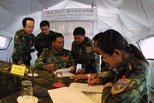 中央軍委副主席、國務(wù)委員兼國防部長曹剛川觀看了演習(xí)聯(lián)合指揮部室內(nèi)演練,參觀了參演國部隊聯(lián)合營地,并分別會見來華參加演習(xí)活動的吉爾吉斯斯坦國防部長托波耶夫、塔吉克斯坦國防部長海魯拉耶夫、哈薩克斯坦國防部副部長波斯別洛夫和俄羅斯駐華大使羅高壽。