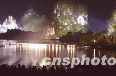 中新社陽朔八月十七日電(記者王永志)素有“山水甲天下”的桂林陽朔昨晚開排山水實景演出《印象.劉三姐》。主辦者稱,以方圓二公里的漓江水域做舞臺,以十二座山峰和廣袤天穹做背景,并有數(shù)百名漁民和專業(yè)演員參加演出,將是世界上最大的山水實景演出。