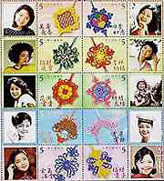 該郵政公司推出的個人化郵票結(jié)合鄧麗君照片以10種不同形式的中國結(jié),分別代表:萬壽長春、四季如意、招財進(jìn)寶、吉祥納福、花開富貴、締結(jié)良緣、步步高升、吉慶有余、金玉滿堂、福增貴子等吉祥口采。
