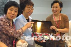 江西與澳門婦女代表成為聯(lián)誼“姊妹團(tuán)”,澳門婦女聯(lián)合會(huì)副會(huì)長賀定一(左二)與江西婦聯(lián)主席李亞平(右一)互贈(zèng)禮品。江西代表團(tuán)贈(zèng)送文房四寶祝愿澳門婦聯(lián)書寫濃墨重彩的新篇章。中新社記者:廖文靜