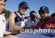 美西時(shí)間二十四日清晨,正在美國(guó)訪問(wèn)的臺(tái)北市長(zhǎng)馬英九沿舊金山灣海岸參加“跑出健康”晨練活動(dòng)并為參加清晨慢跑的晨練者簽字留念。作者:陳鋼