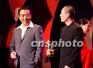 中國電影第九屆華表獎三十日晚在北京北展劇場揭曉,張藝謀導(dǎo)演的《英雄》獲特殊貢獻獎與優(yōu)秀對外合拍片兩項大獎。圖為陳凱歌為張藝謀頒發(fā)特殊貢獻獎。中新社記者:武仲林