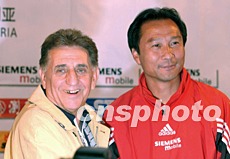 九月八日下午,即將參加十日舉行的雅典奧運會足球預選賽的中國U23隊(國奧隊)主教練沈祥福(右)和敘利亞隊主教練沙馬斯(左)在昆明舉行聯(lián)合記者會。中新社記者:張煒