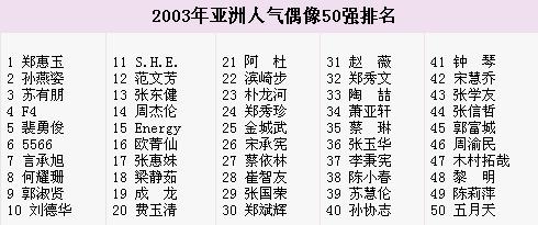 據(jù)聯(lián)合早報(bào)報(bào)道,“2003年亞洲人氣偶像50強(qiáng)”投選范圍包括從事演藝、歌唱、體育、模特兒及服裝界的亞洲人士。經(jīng)過5周熱烈的投票,吸引將近7萬(wàn)張選票。