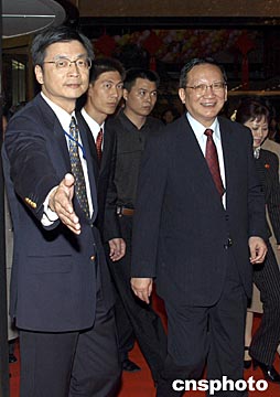 國(guó)務(wù)委員唐家璇(右)二十一日在長(zhǎng)沙接見參加“第二屆世界華文傳媒論壇”的代表,中國(guó)新聞社副社長(zhǎng)劉北憲(左)迎接。中新社記者:張宇