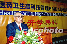 中山大學(xué)醫(yī)藥衛(wèi)生高科技管理EMBA學(xué)位項(xiàng)目的開學(xué)典禮二十六日在廣州中山大學(xué)嶺南學(xué)院舉行,這是中國第一個獲準(zhǔn)頒發(fā)醫(yī)療服務(wù)方向管理教育(EMBA)學(xué)位的項(xiàng)目。圖為嶺南(大學(xué))學(xué)院董事會名譽(yù)主席伍沾德先生在典禮上致詞。作者:羅仰明
