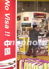 日本人赴中國(guó)短期旅行免簽證,成為招徠日本游客的新手段,十月三日在日本橫濱開幕的世界旅行博覽會(huì)上,中國(guó)展臺(tái)豎起了免簽證的宣傳牌。作者:王健