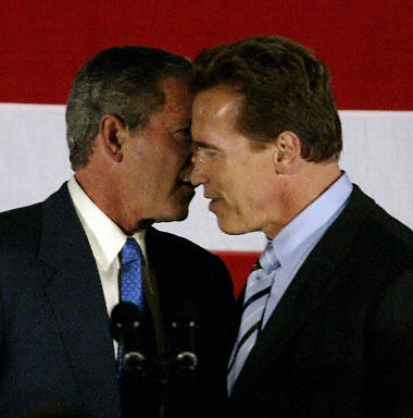 美國總統(tǒng)布什16日前往加利福尼亞,與剛剛在州長競選中勝出的阿諾·施瓦辛格會(huì)面,希望阿諾的人氣為他拉升明年總統(tǒng)大選的選情。圖為布什與阿諾交談。