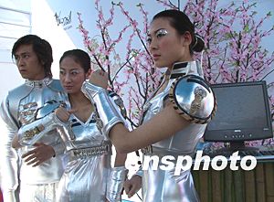首屆中國(guó)國(guó)際網(wǎng)絡(luò)文化博覽會(huì)十月二十三日在北京中華世紀(jì)壇開(kāi)幕,近百家網(wǎng)絡(luò)知名企業(yè)和網(wǎng)絡(luò)媒體參展,上海一家網(wǎng)絡(luò)游戲運(yùn)營(yíng)公司的模特身著《破碎銀河系》網(wǎng)絡(luò)游戲中角色的服裝在展臺(tái)前表演。中新社記者:張勤