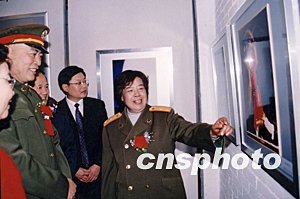 一百一十周年邵華舞臺藝術攝影作品展,十一日在山東省城濟南東方藝術館舉行,毛澤東的兒媳婦邵華(右一)少將向來賓介紹作品。作者:郝帆